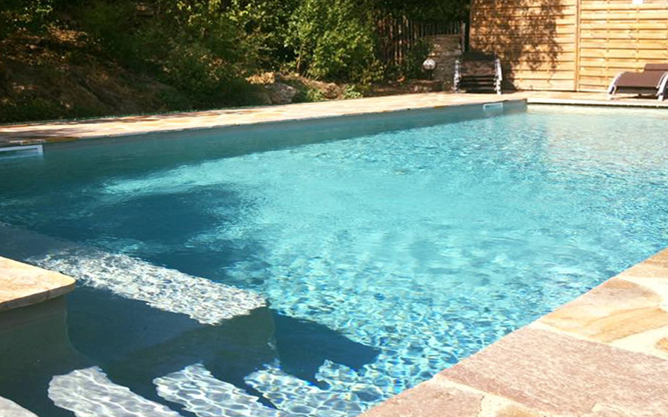 Le jardin de 4000m2 est paysagé avec des jeux pour enfants, une piscine sécurisée de 4mx8m commune aux trois gites.